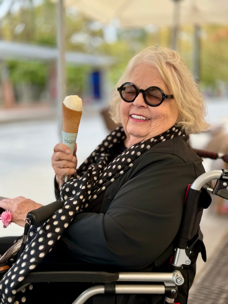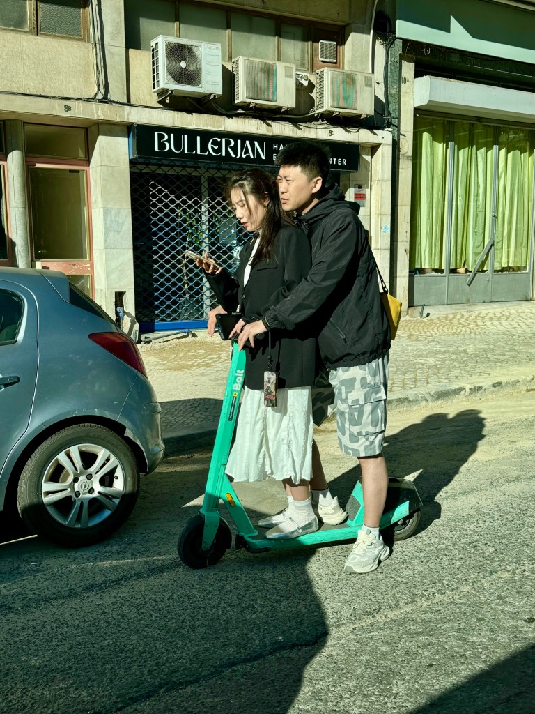 Outside we made an “executive decision” to visit the ice cream shop across the street. Relaxing at a table under an umbrella we ate our ice cream (very delicious), talked, people watched etc. etc. Right next to our table was a bike path with tons of traffic including pedal bikes, electric bikes, three wheelers, and electric scooters – many moving at a very fast clip. Just beyond the trail was a tram station with trains frequently moving in both directions. The electric tram would pull into the station, from the top of the middle car a charging attachment would go up to touch a charger for 30 seconds, then retract and the tram would depart. Very efficient, very cool.