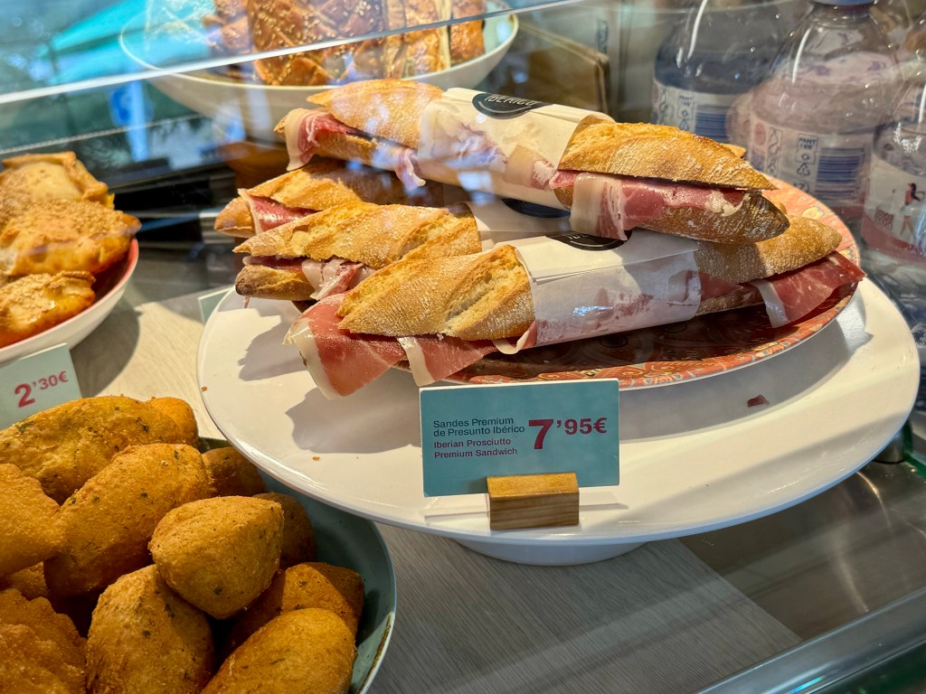 The hotel is amazing – the building even more amazing. Pat was taking a nap so the three of us held court in the open atrium with delicious Mojitos and even more delicious Iberian Ham. Life is good.