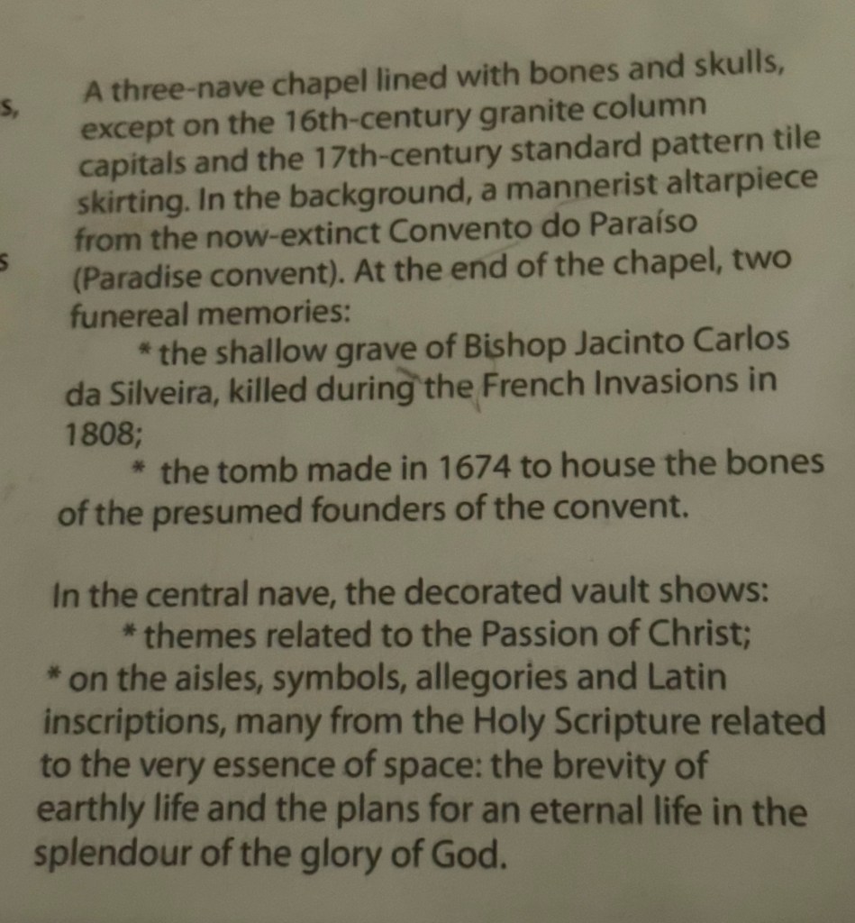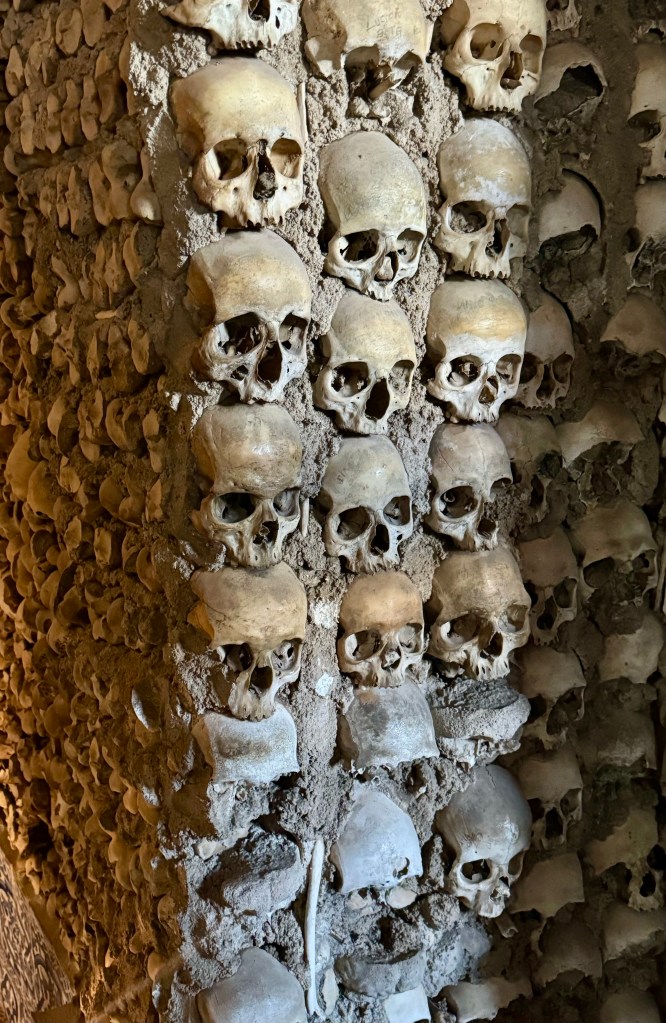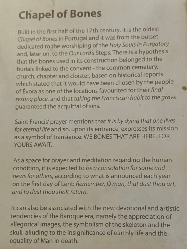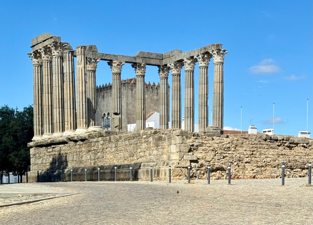 We meet our guide by a large fountain. Again, the App guides us there. This is a very hilly town with nothing but cobblestone streets and walkways. It is a very good thing that the guides recommended that Karen NOT come today. Let me repeat the opening remarks about Évor from Trek Travel (Tessa see photo). There are over 50 churches and we start with the largest – amazing. The 2000+ year old Roman Temple remains stand tall and strong. I note the beautiful design of the columns. We end with a tour of the bones temple. My photographs speak for themselves.