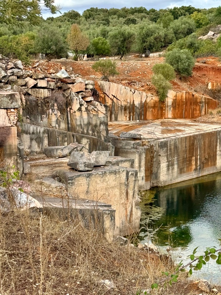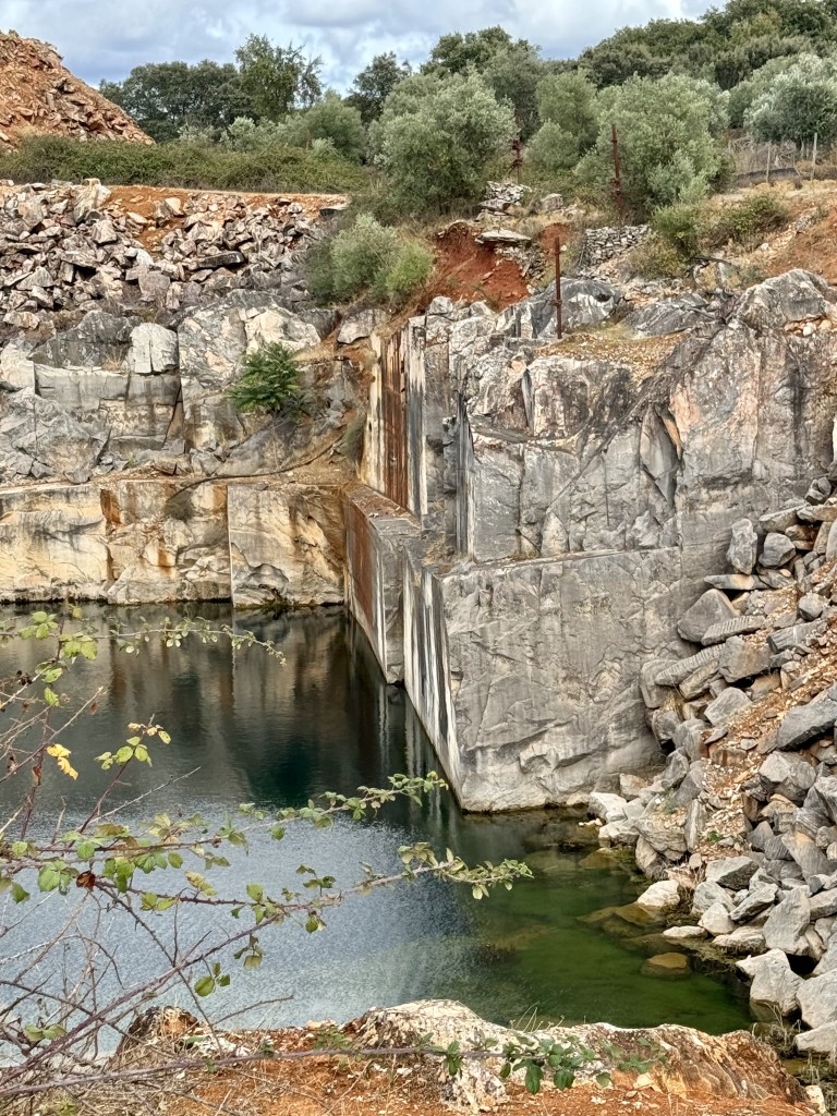 We pass by the marble quarries with their huge piles of scrap – “marble mountains”. We are scheduled for a marble tour later this week. Then we ride back into the country – wine yards, oak trees, the occasional small gathering of livestock (we have seen very few cattle, sheep or goats in Portugal). Off to our right I see several tall very colorful sculptures near the entrance to a wine estate. Are they giant styrofoam blocks? No! They are marble! I loved them and ask our guide if we could stop on our return – no we return a different way. I am certainly going to learn more about this unusual sighting.
